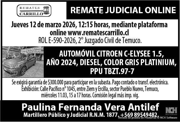 REMATE JUDICIAL CAUSA ROL E-590-2026. 2DO JUZGADO CIVIL DE TEMUCO – CITROEN C-ELYSEE AÑO 2024 TBZT.97-7