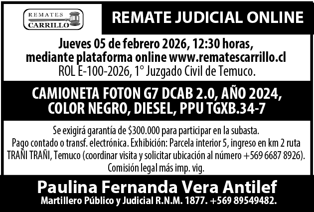 REMATE JUDICIAL CAUSA ROL E-100-2026. 1ER JUZGADO CIVIL DE TEMUCO –CAMIONETA FOTON G7 AÑO 2024, PATENTE TGXB 34. Color NEGRO, DIESEL 4×2.